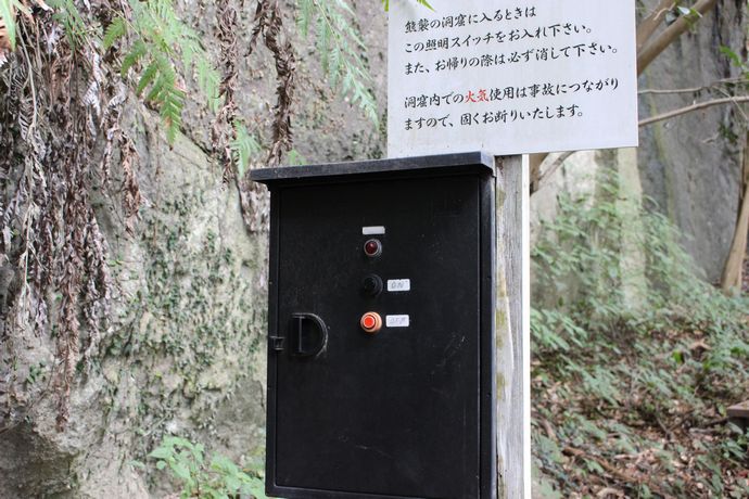 洞穴右側にあるこのボタンを押せば電気がつくそうな。。※帰りにはちゃんと切りましょう
