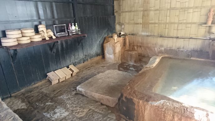浴室にはシャワーなどはありません。左にあるかけ湯で身体を流し、添えつけのシャンプーやボディーソープで身体を洗います。