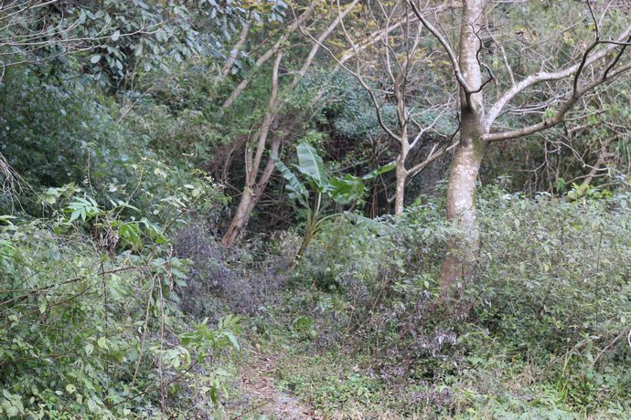 空地に車を停め、川沿いのけもの道に入ります。↓