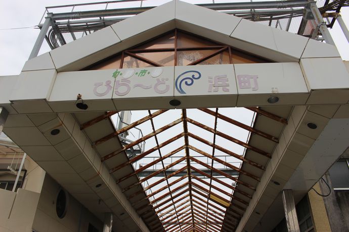 屋根が破れたアーケードも。。通りはシャッターが。。