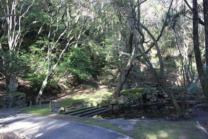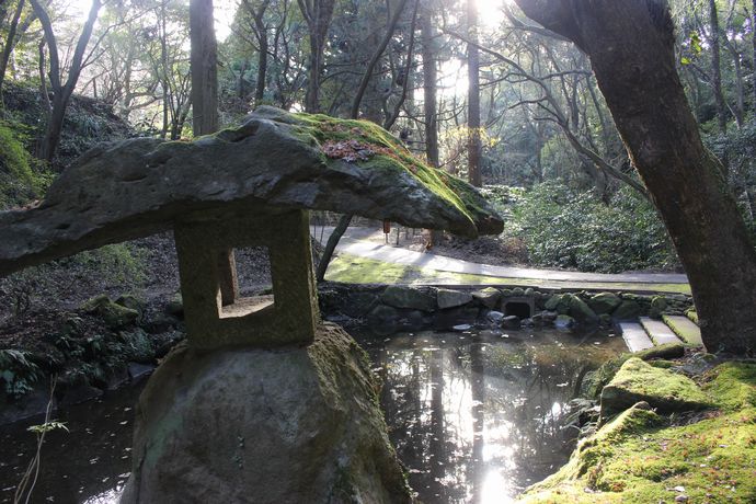 いくつか石灯籠があったり、池のそばには椅子などもありますので、寺山炭窯跡に向かう小休止にはちょうど良い場所です。すでに紅葉の時期は過ぎていたので紅葉は拝めませんでしたが、池にはもみじの枯葉が多数ありましたので、紅葉時期は綺麗な風景が見れると思います。
