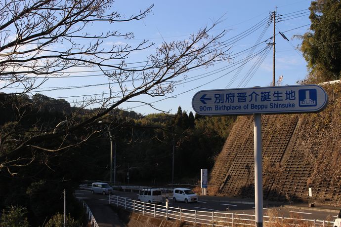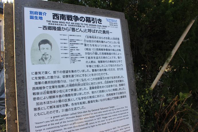 説明しづらい場所にある別府晋介の生誕地。酒のキンコーの前を右方向に下っていき、カーブ左手に案内版が現れます。