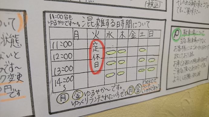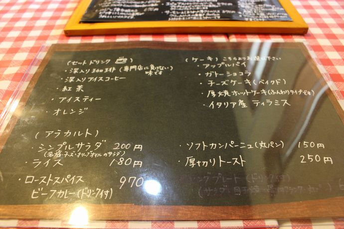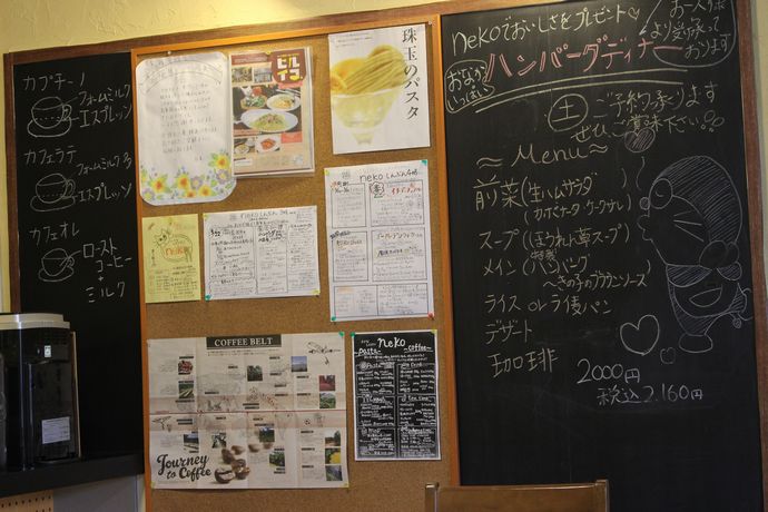 各種メニューの案内や、期間限定のサービス、今月の珈琲の案内など。最近少なくなった、温かみのある文章や手書きの絵による案内にほっこりさせられます。