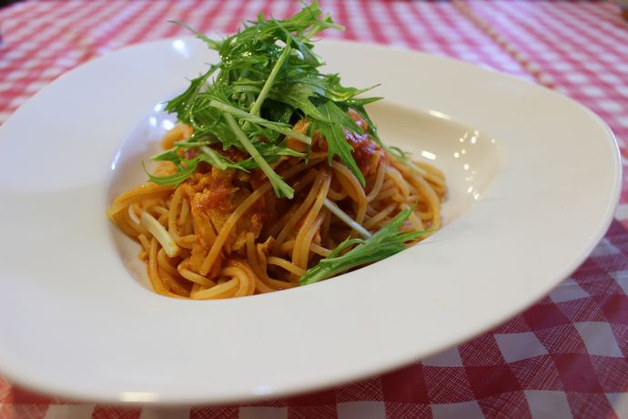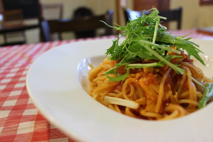 そして本日のパスタ!この日は「やわらかチキンと水菜のトマトソース」