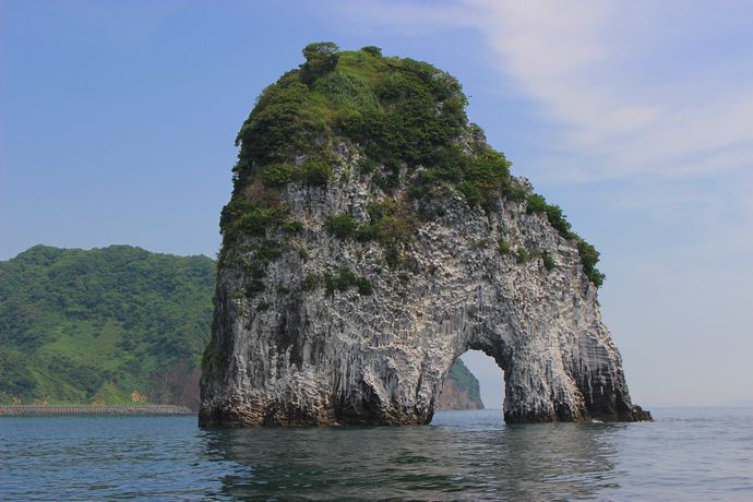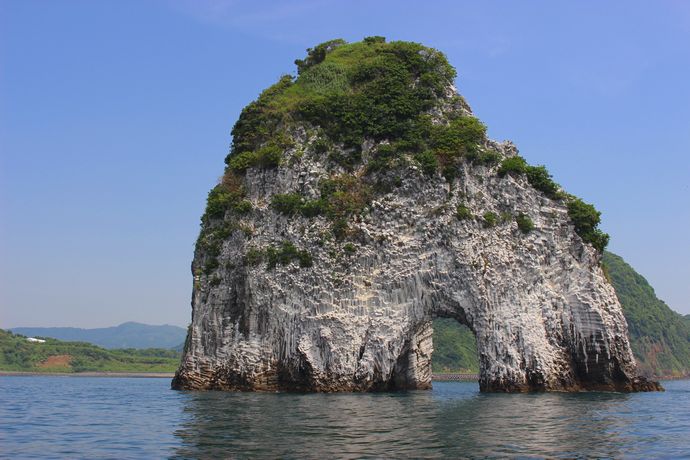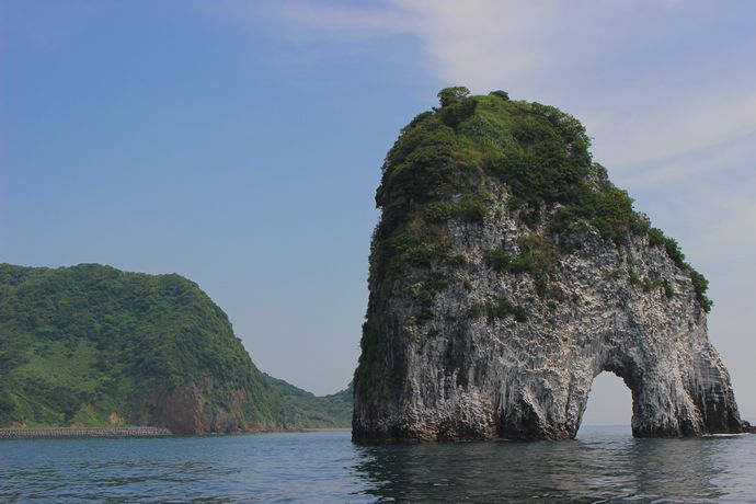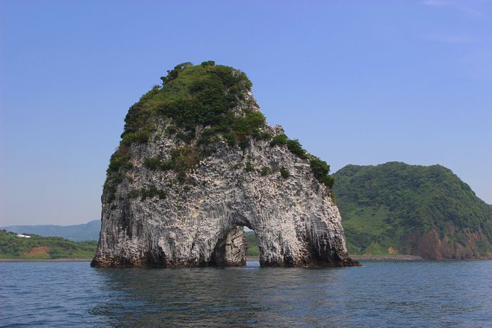 いろいろ調べてみると「俣川洲(またごし)」という名が江戸時代には見られていたそうで、付近にある竹山と同様、大昔の火山の名残だそうです。それが海水で削られトンネルができたんだとか。。