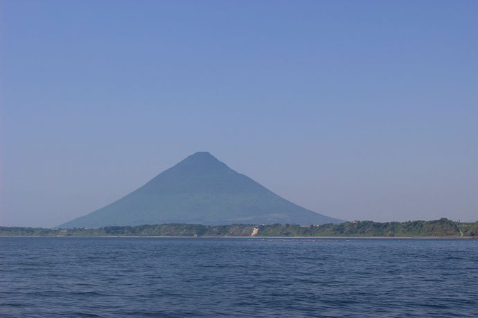 俣川洲の前で船は停泊し、ご説明を拝聴。反対側は開聞岳がそびえます。美しい姿です。