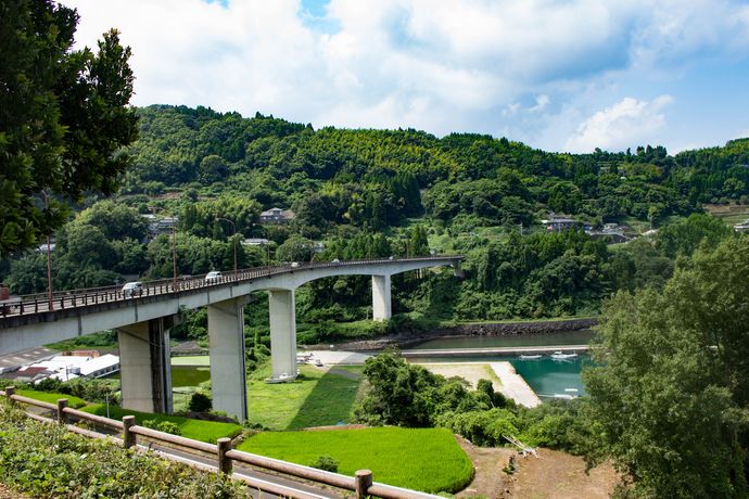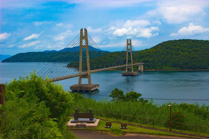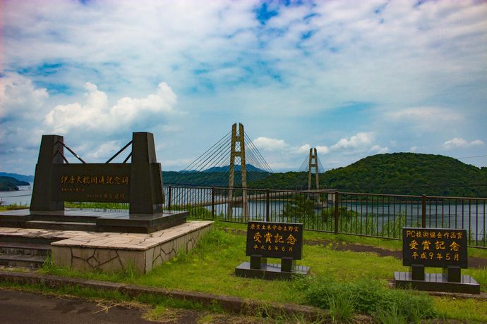平成9年に開通した赤崎橋。この赤崎橋のそばは、ちょっとした高台のある公園に整備されています。駐車場付近からのぞむ赤崎橋もよいですが、少し上まで登って望む姿もなかなか良い場所です。