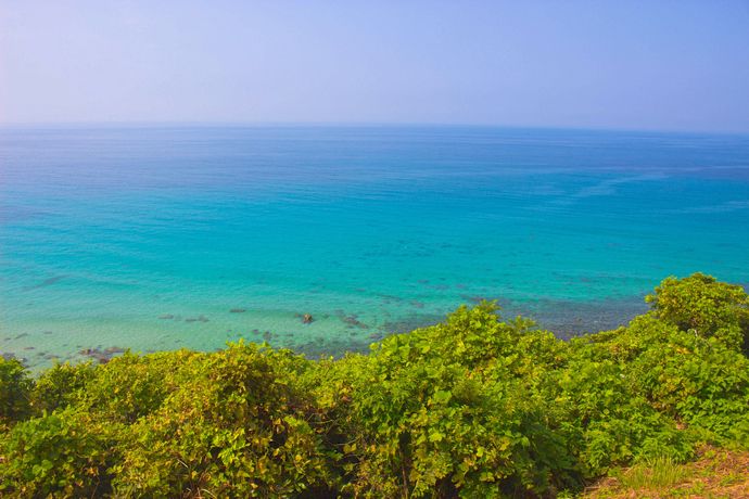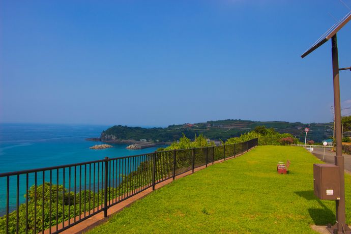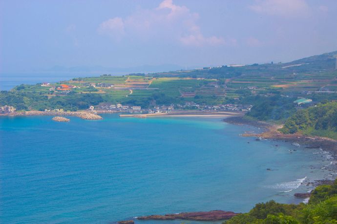 黒之瀬戸自然公園(うずしおパーク)から、国道389号を進むかたちで、島の西側を北上。すると途中道路沿いに、夕日の名所でもあり、長島の見どころの一つ「汐見の段々畑」とラムネ色の海が魅力の景観スポットがあらわれます。