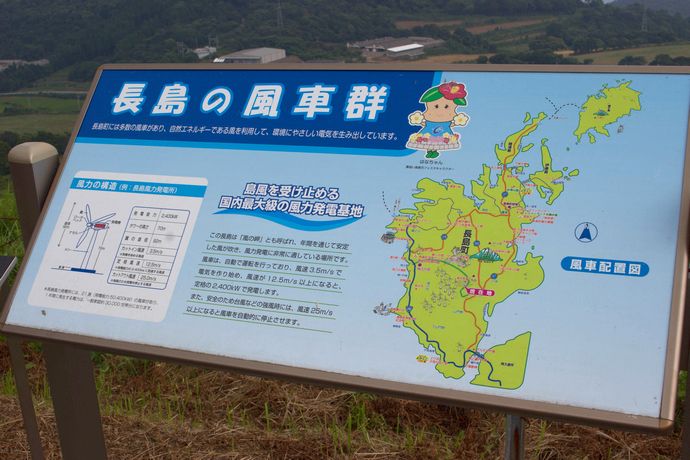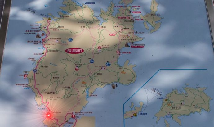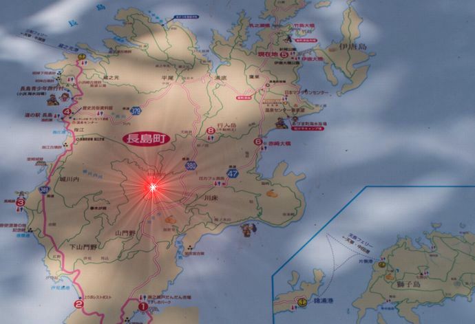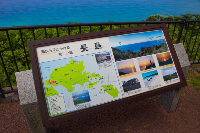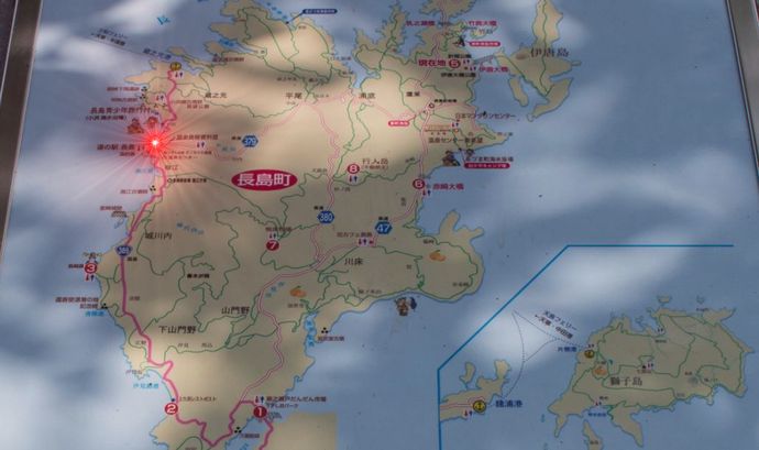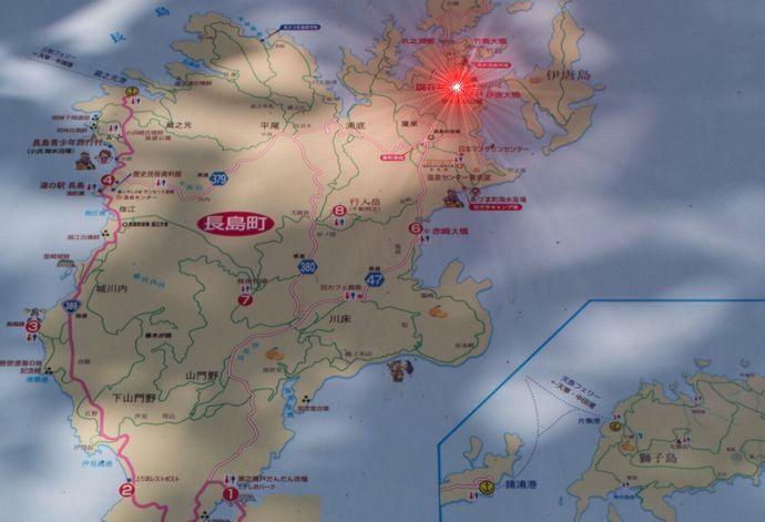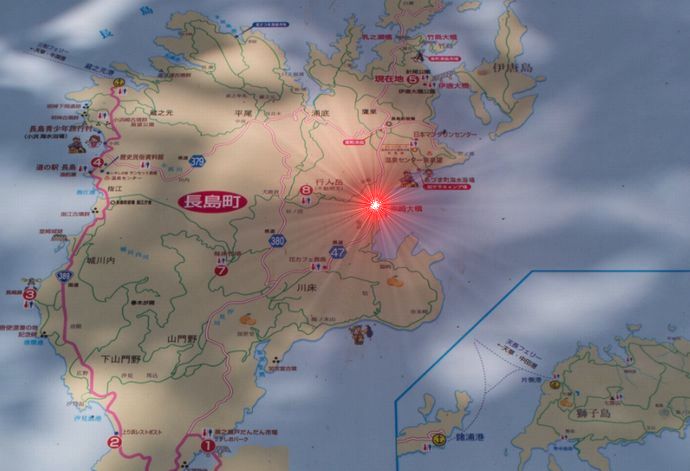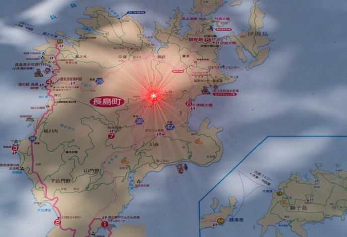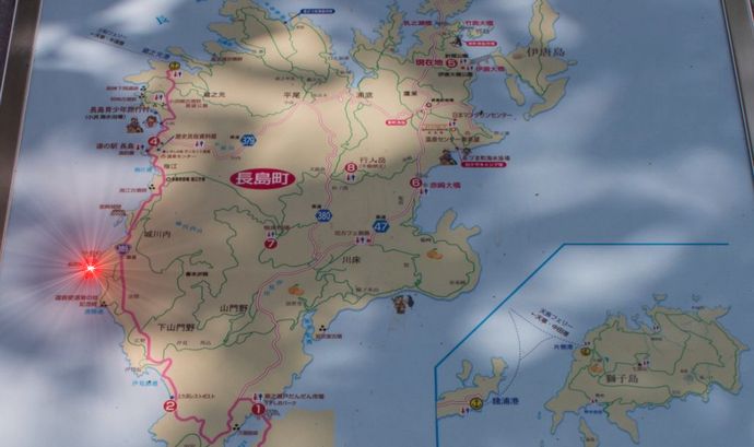 長崎鼻灯台公園より国道389号に戻りさらに北上。しばらく行くと、長島町歴史民族資料館やサンセット長島の案内がでてきますので、右手の坂を登っていきます。