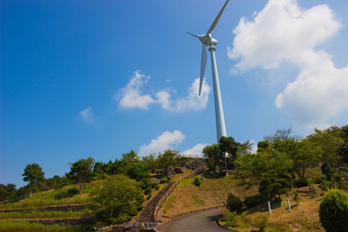 サンセット長島、歴史民族資料館を横目に風車の麓を目指すと駐車場が見えてきます。ここが、長島ふうしゃ公園です。