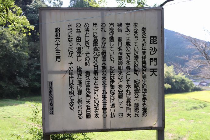 寿永文治年間伊集院に壱宇治城を築き権勢をふるっていた時の郡司・紀時清公(藤原氏支族)は城の守り本尊として本丸に毘沙門天、観音、春日明神薬師如来などを安置して、四方を守護していた。紀氏は伊集院氏に追い払われ、やがて戦国末期の天文十九年(1550年)に島津貴久が父日新公と共にこの城を攻め落とした。その時、貴久は毘沙門天を日置の五丁田へ遷座し、後現在地に移し祭られるようになったが、その年代は不明である。とのこと