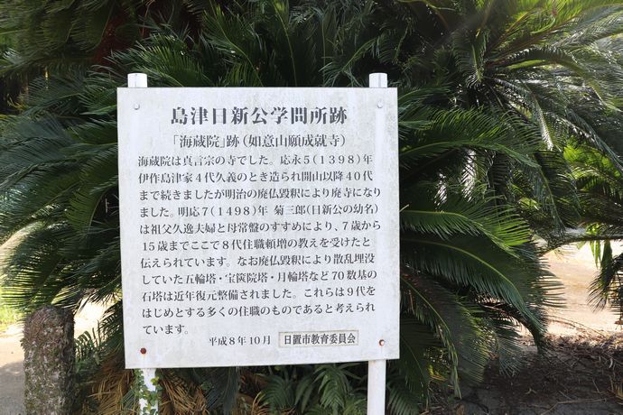 幼児期に暴れん坊だった日新公は、母常盤により伊作亀丸城の川向いにある「真言宗海蔵院」の8代住職頼増に預けられ、厳しい教育を受けることになります。