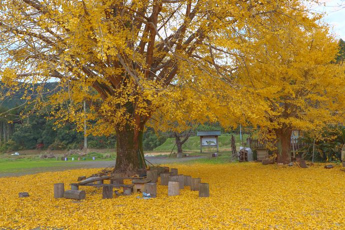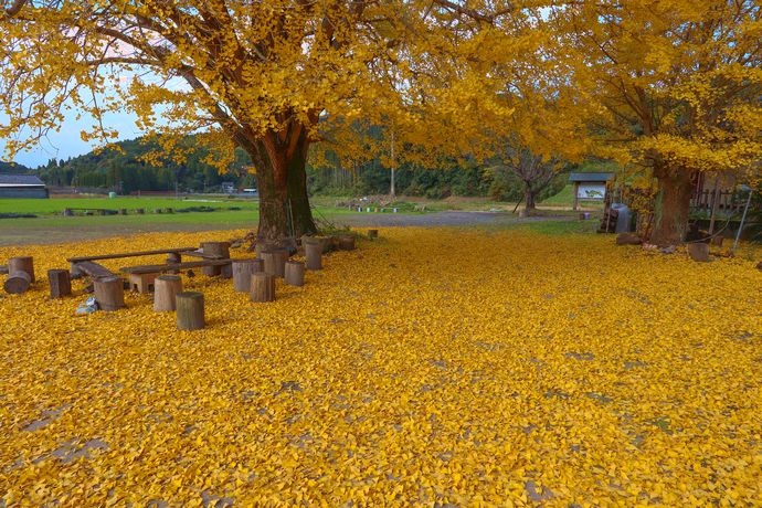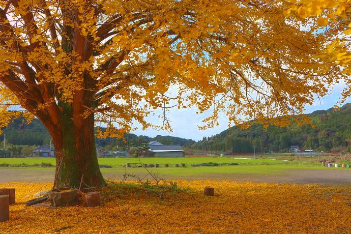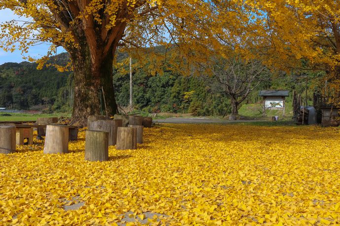 【肝付町】本城の大銀杏(イチョウ)と黄色い絨毯
