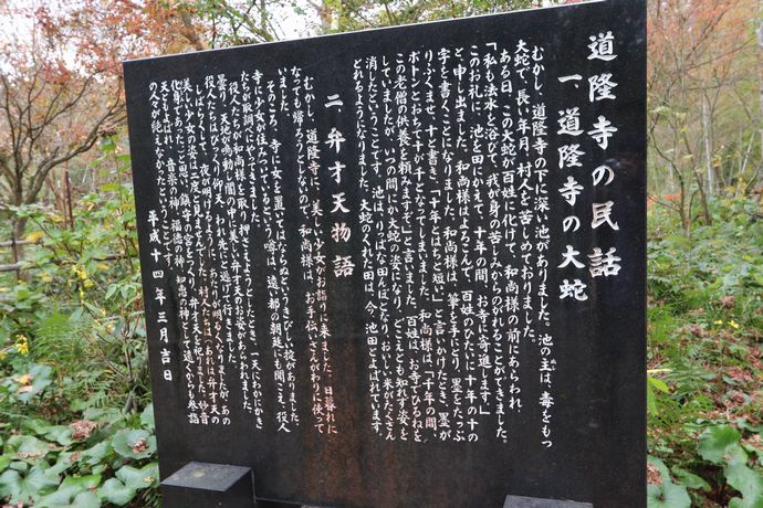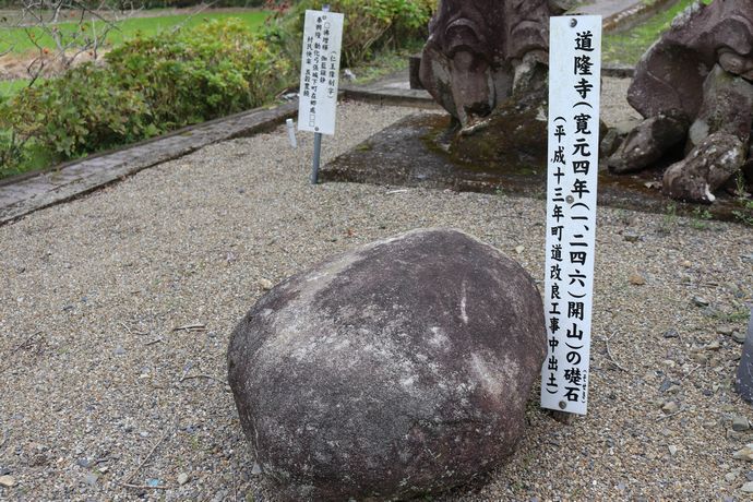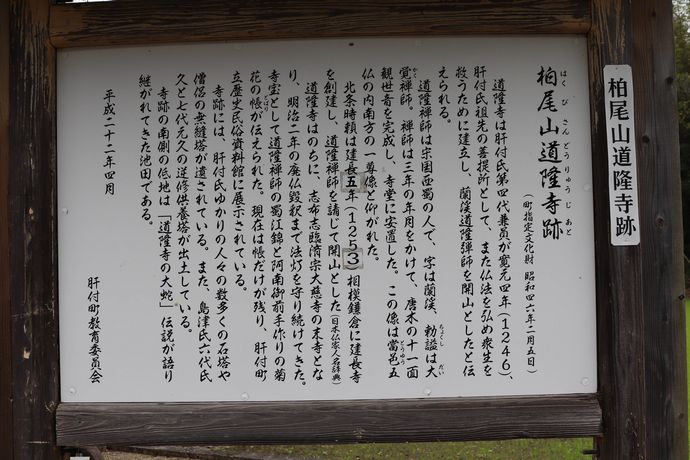「道隆寺は肝付氏第四代兼員が寛元四年(1246)、肝付氏祖先の菩提所として、また仏法を弘め衆生を救うために建立し、蘭渓道隆禅師を開山としたと伝えられる。 道隆禅師は宋国西蜀の人で、字は蘭渓、勅謚は大覚禅師。禅師は三年の年月をかけて、唐木の十一面観世音を完成し、寺堂に安置した。この像は當邑五仏の内南方の一尊像と仰がれた。北条時頼はのちに、志布志臨済宗大慈寺の末寺となり、明治二年の廃仏毀釈まで法灯を守り続けてきた。寺宝としては道隆禅師の蜀江錦と阿南御前手作りの菊花の帳が伝えられた。現在は帳だけが残り、肝付町立歴史民俗資料館に展示されている。寺跡には、肝付氏ゆかりの人々の数多くの石塔や僧侶の無縫塔が遺されている。また、島津氏六代氏久と七代元久の逆修供養塔が出土している。寺跡の南側の低地は『道隆寺の大蛇』伝説が語り継がれてきた池田である。」