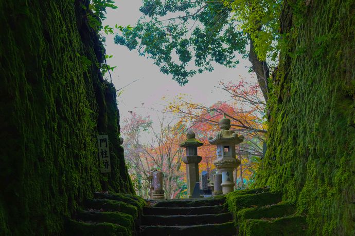 石段と石垣、向こうに見える灯篭と紅葉。良い雰囲気です。