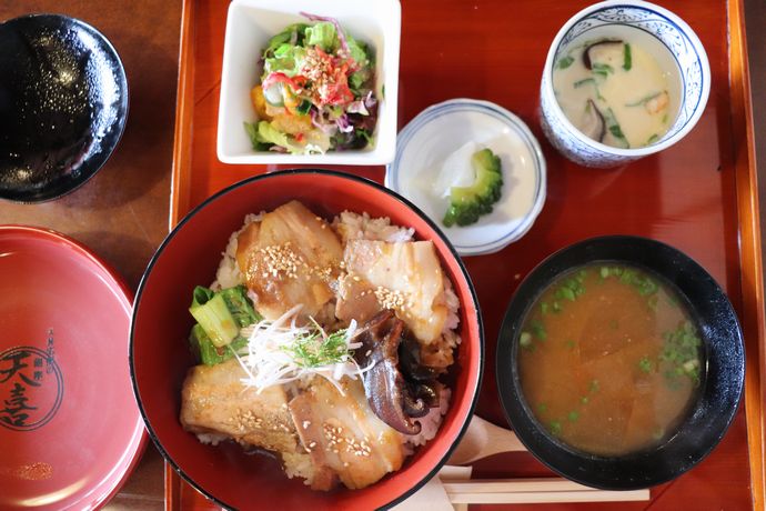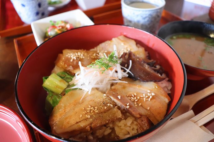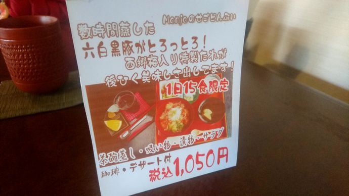 西郷隆盛が愛した豚肉と麦みそがテーマの丼とのことで、Monjyoさんでは六白黒豚のバラを数時間蒸したものと、西郷梅を隠し味にした味噌だれとのマッチング!トロットロの黒豚が美味いんだ!これが!!