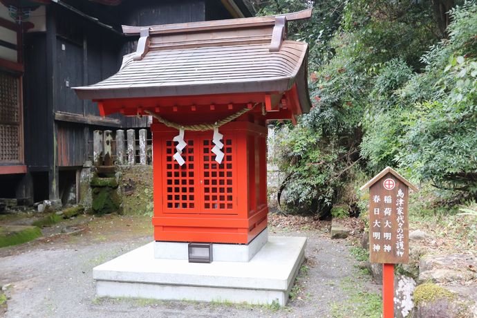 お隣にはお稲荷様と春日大明神も。島津家の守護神ですからね。。元々は参道途中にある山手側にあったようです。