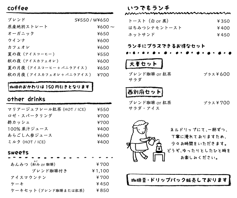 メニューは以下の通り。※自家焙煎珈琲ぼちぼち様のホームページより