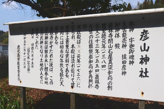 三国名勝図会によると直林寺のふもとに鎮守堂があり彦山権現を祀っているとのこと。それがこの彦山神社です。