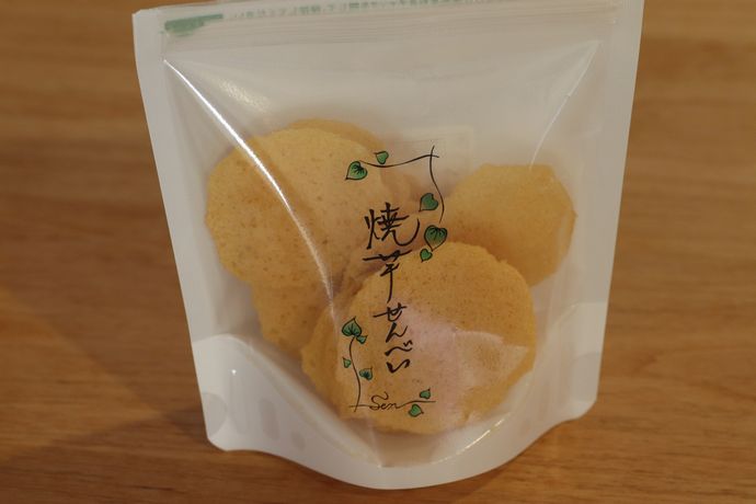 紅はるかをペースト状にしでん粉を混ぜ焼き上げたせんべい。油や砂糖は不使用で芋そのものなので当然無添加。ペースト状にしてから焼き上げることにより、口当たりがやさしくなり、お年寄りでも食べやすいです。