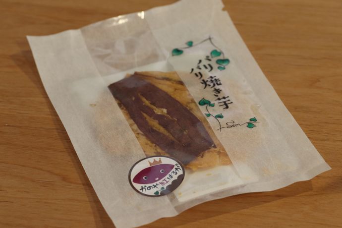 糖蜜たっぷりの紅はるかを遠赤外線によりじっくりと焼き芋に。その後、この焼き芋をせんべい焼き機でパリパリに焼き上げた一品。純度100%芋のパリパリせんべいですが、すんごく甘い!!