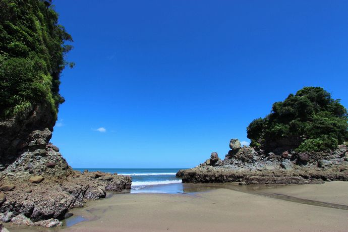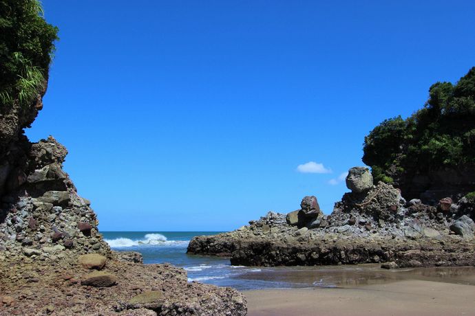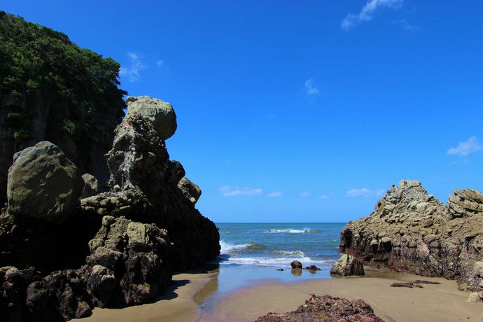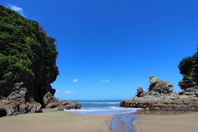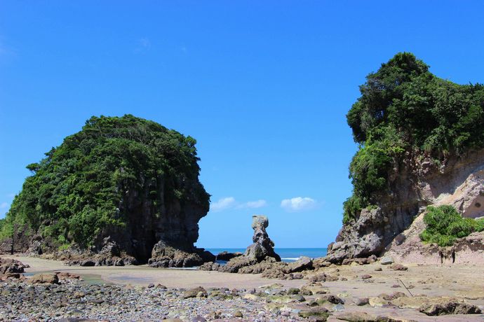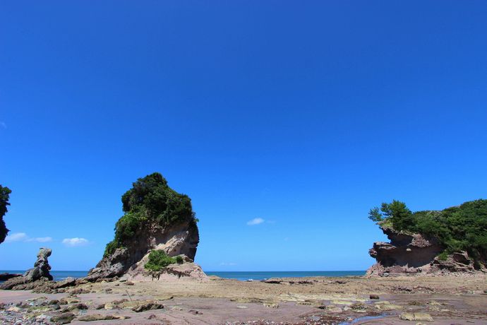 人形岩を過ぎた先にある西方海水浴場の駐車場。ここからなら満ち潮、引き潮関係なく、それぞれの状況に応じた場所まで近づくことができます。
