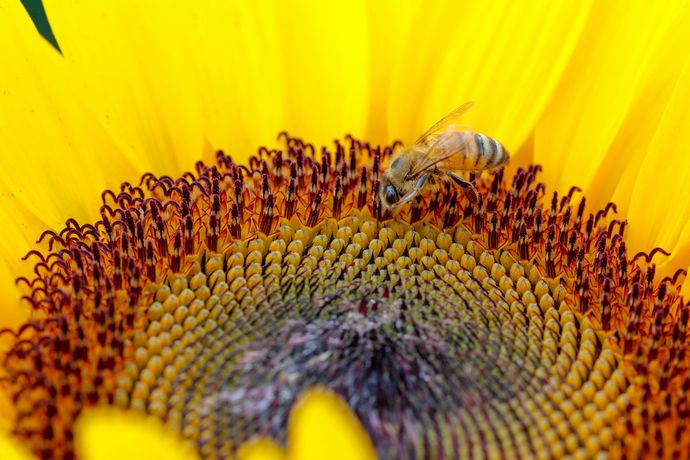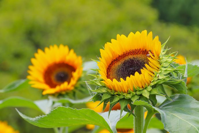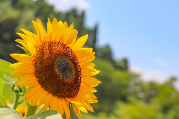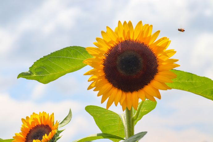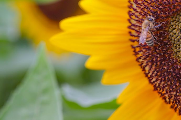 ミツバチが多くて、たまたま飛んでる様子が入りました(笑)ちなみに蜜の採取に一生懸命なので、こちらが危害を加えなければ、特別襲われるということはありませんので、安心してひまわりを見ていられます。