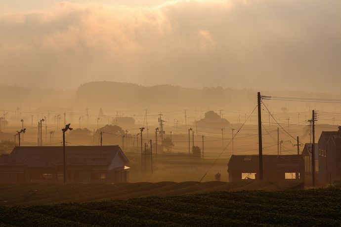 朝もやの中の茶畑