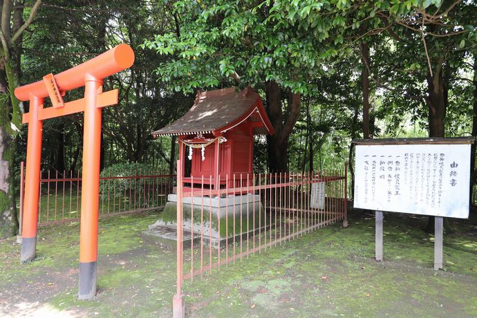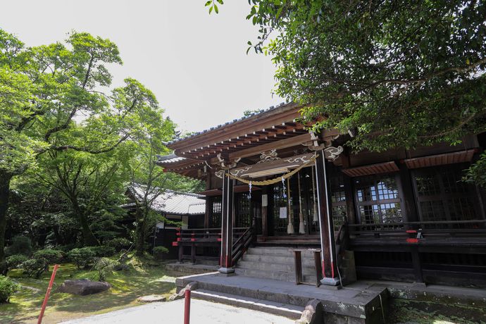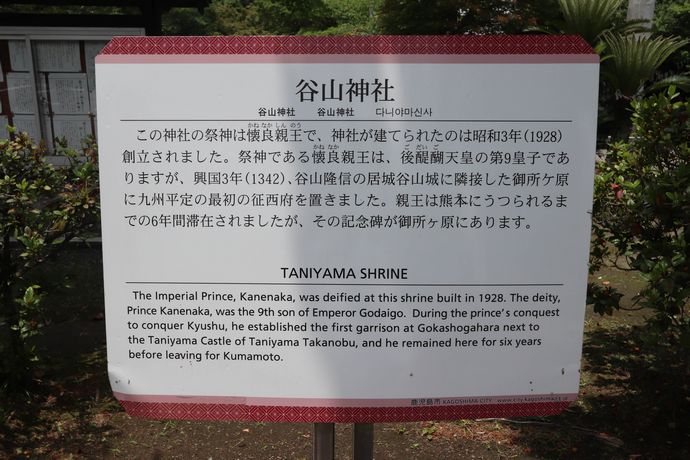 御祭神懐良親王は、延元元年後醍醐天皇の命に依り鎮西統一のため征西将軍宮に任ぜられた。興国三年五月(阿蘇文書)、谷山城主谷山五郎隆信は親王を千々輪本城に迎えて本城より約二十町(二千二百米)の高台に御所を建て、衷心よりこれを奉迎した。此の地を今御所ヶ原と呼び、親王の石碑が立っている。昭和三年谷山町民は、懐良親王の英霊を慰め奉り神徳を宣揚し道徳の涵養に努めようと当社を創建した。