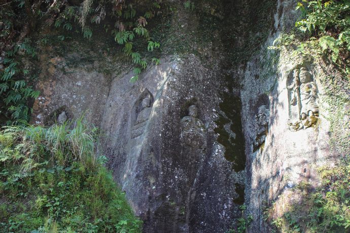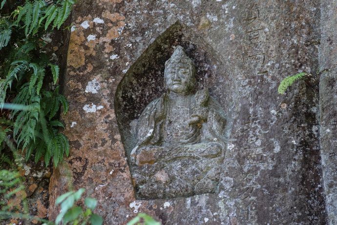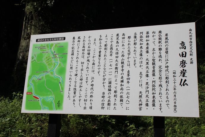 廃仏毀釈の際に藪で隠れていたことにより、破壊をまぬがれたといわれている高田磨崖仏