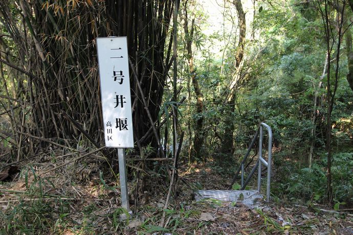 この道を進んでいると右手に降りられる場所があり、それが二号堰案内がある写真の場所になります。ちなみにこの道をさらに進むと右手に祠があります。