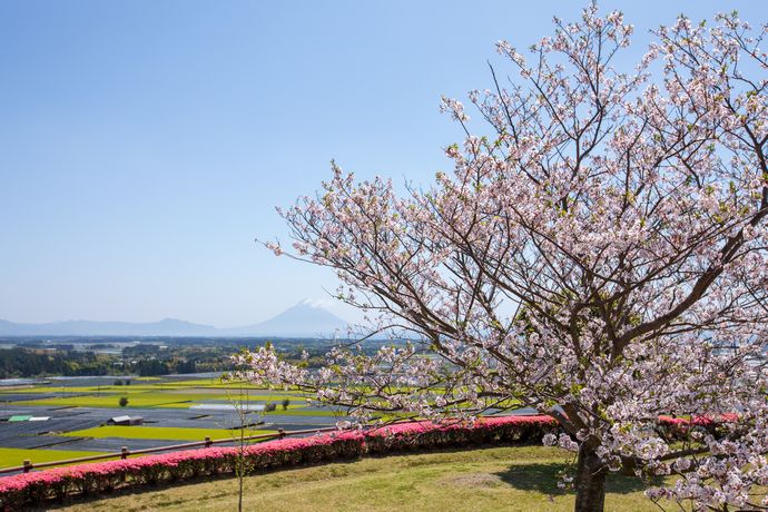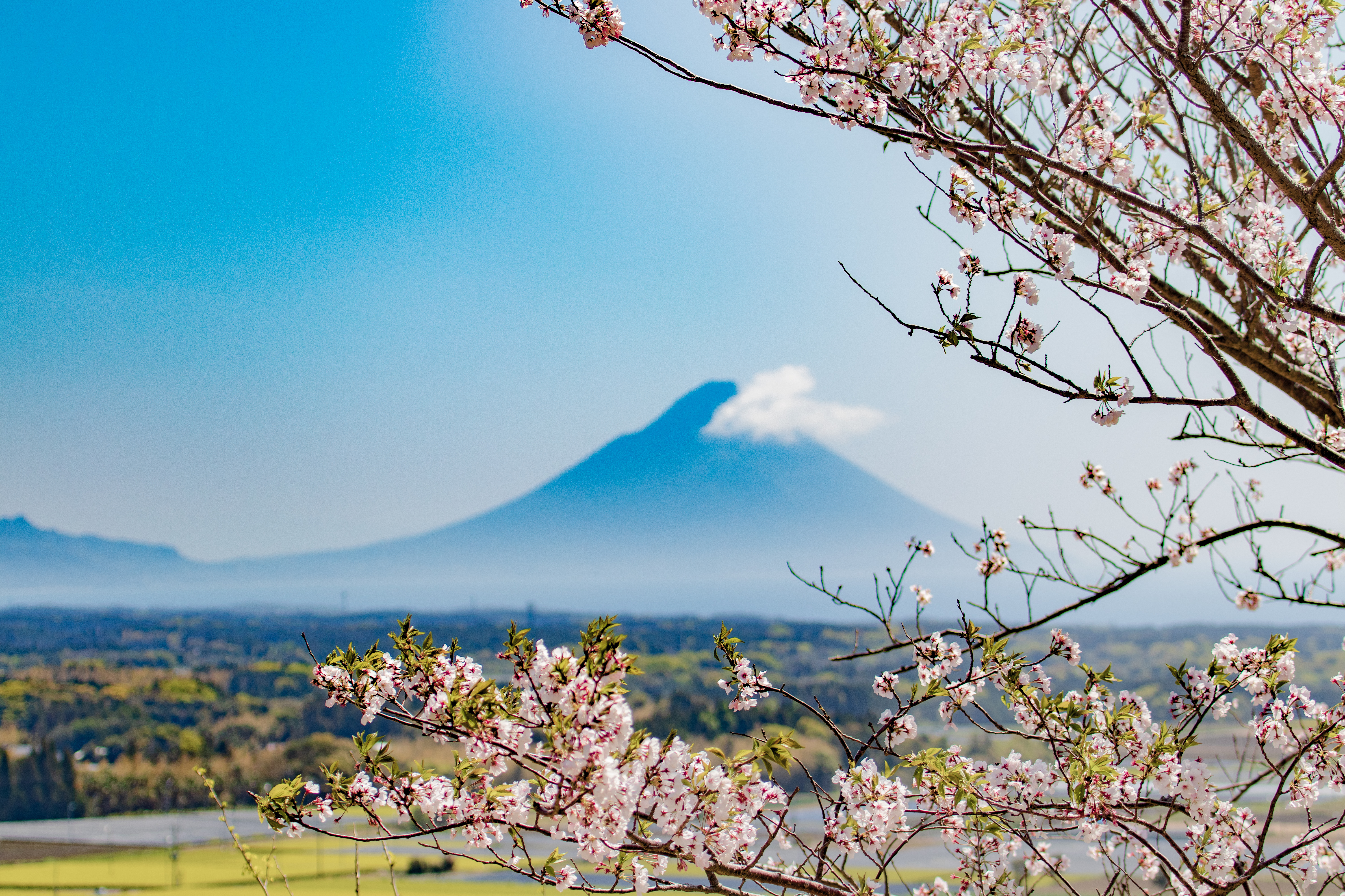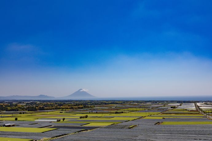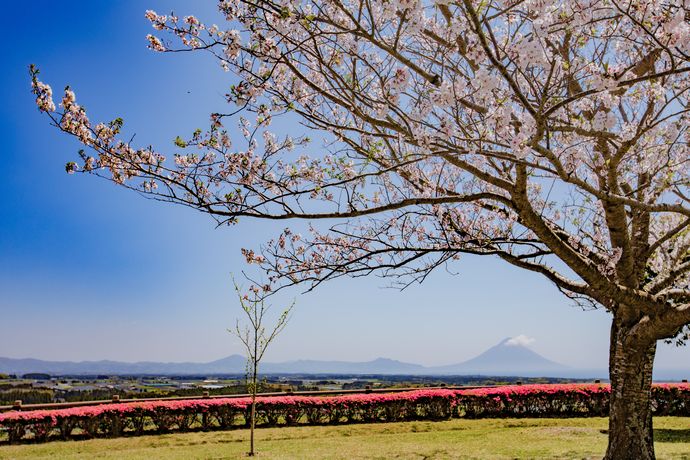 薩摩富士と呼ばれる開聞岳、全国屈指の特産品である南薩摩のお茶、そして春を感じさせる代表格の桜、これらが一堂に集まる短い瞬間…