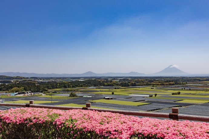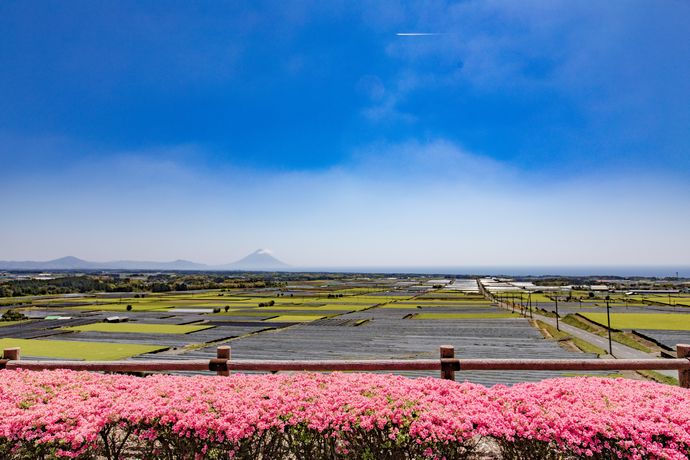 しかし、園内にはツツジも咲いており、被覆シートにかかった茶畑含め、春らしい景色が広がります