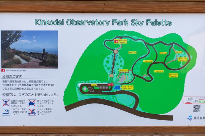 指宿スカイラインで最も充実した設備を誇る展望台がこの「錦江台展望公園 スカイぱれっと」トイレだけでなく、売店や吊り橋、散策路もあり駐車場も広々しています。