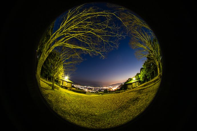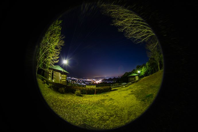 続けて、すっかり日の落ちた展望台から夜景を望んでみます。ここが魚眼レンズで代行。。