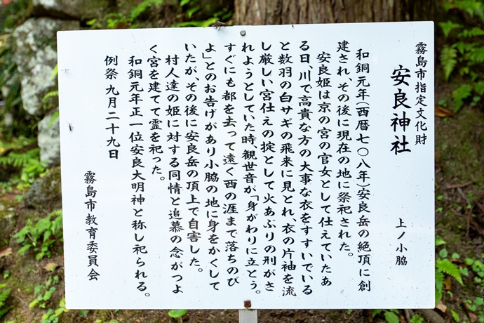 神社には貞永五年、康応二年の棟札や板碑、古文書など多数を蔵する。享保十九年には正一位安良大明神の贈位があり、昔から大隅五社の一つに数えられていた。