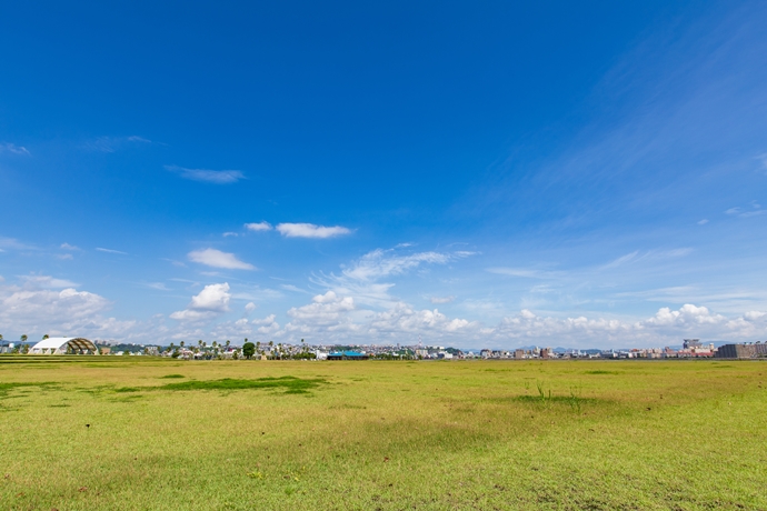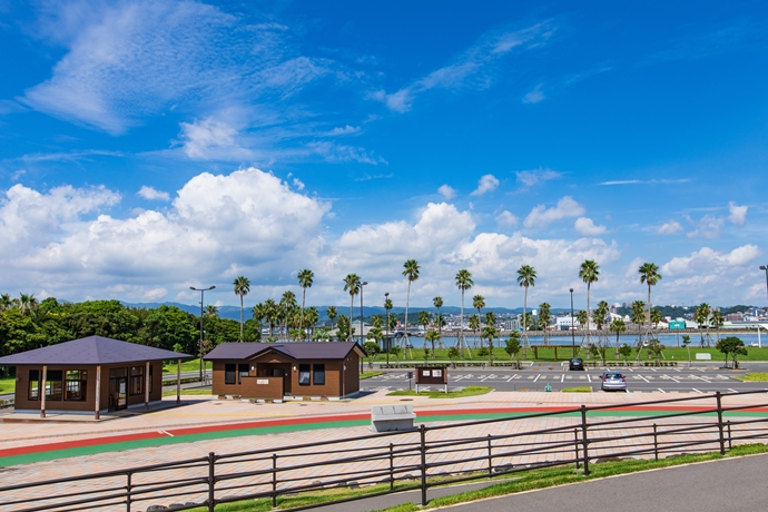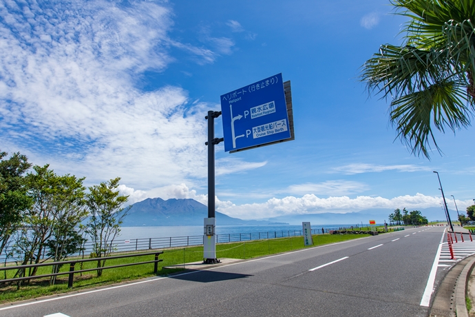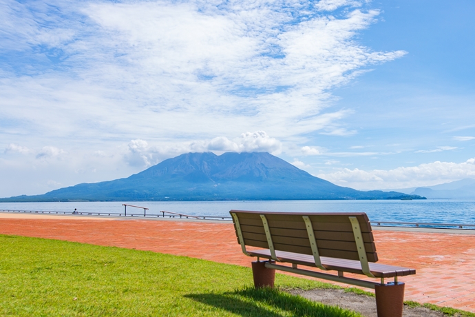整備された港湾の緑と青い空や海とのコントラストは南国らしさ満点で、なによりも正面に見える桜島の存在感!