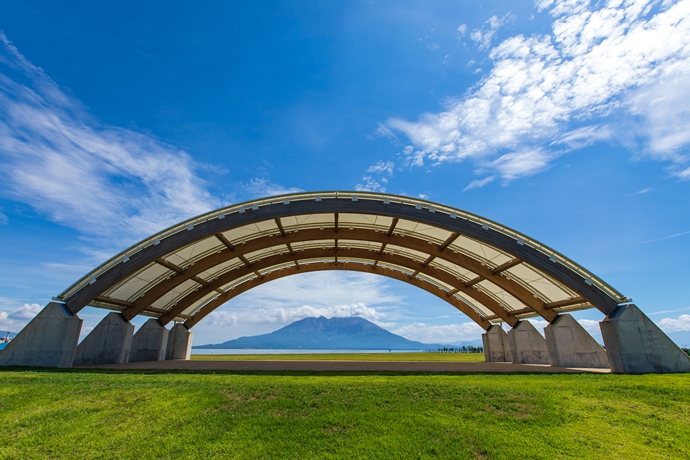 イベントでも使われるステージのアーチ状の屋根と桜島