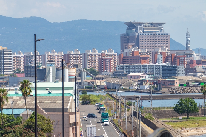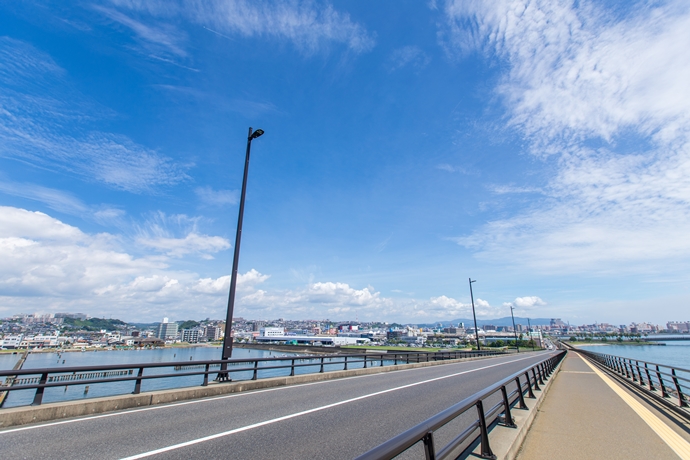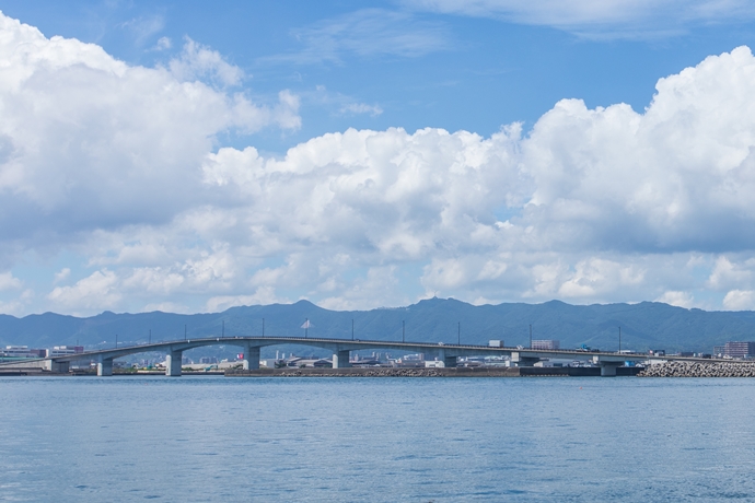 マリンポートから見えるこの橋「黎明みなと大橋」。イオン鹿児島や鹿児島市南部地域に繋がる橋です。クルーズ船を正面や逆サイドから見たい場合は、この橋を目指しましょう。