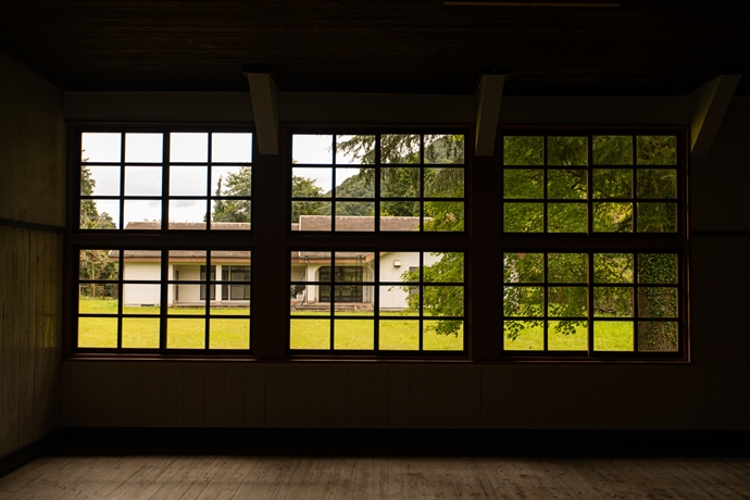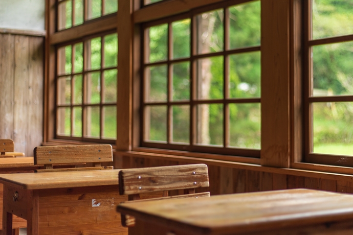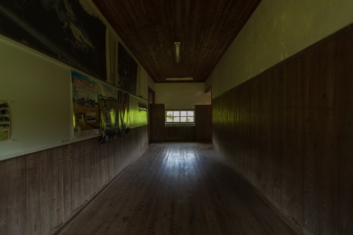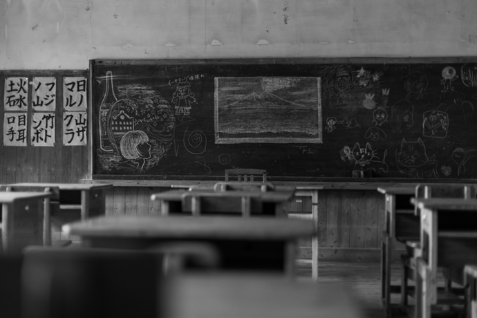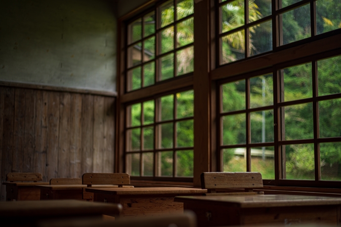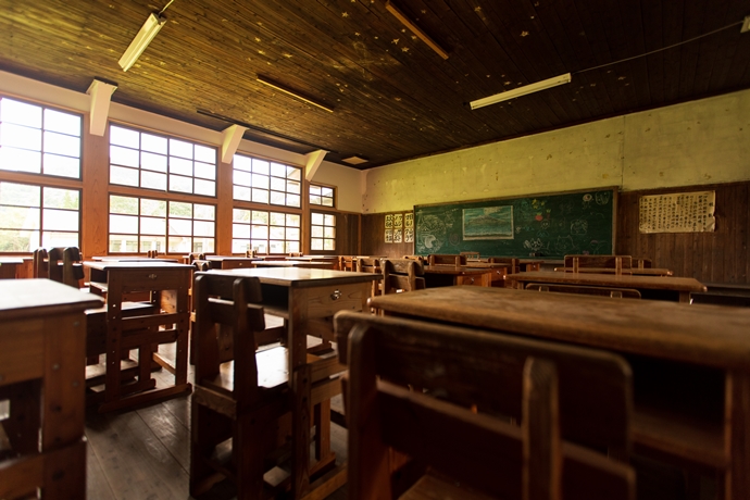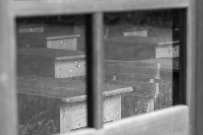 窓から教室をのぞいてみる。かつてたくさんの子供たちがいた場所。。