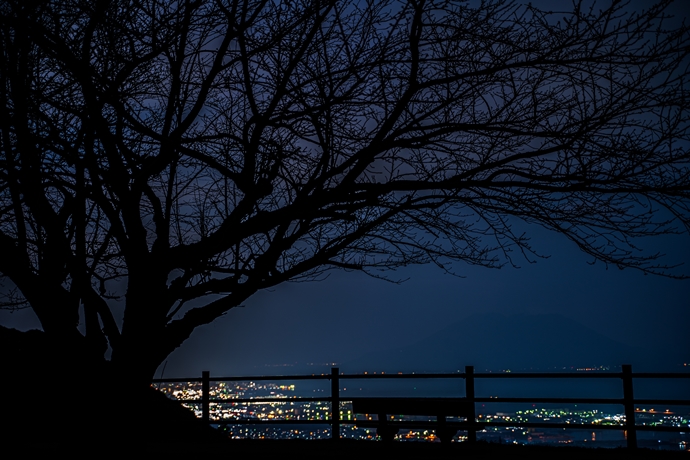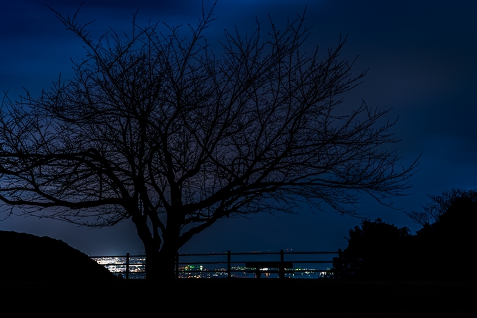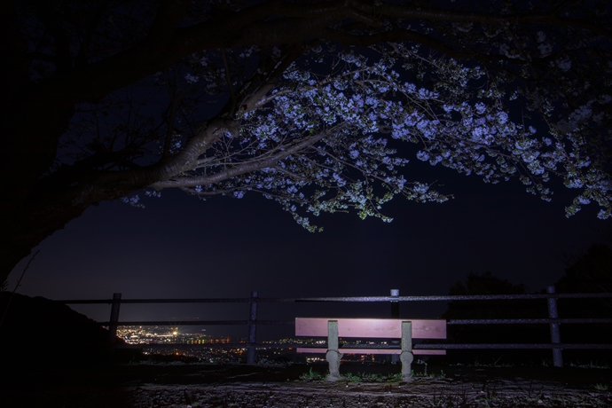 夜に来てみました。夜景スポットとして知られている場所でもあるため、夜景がきれいなのは知っていましたが、やはりこのベンチと桜の木の風景はいいですね