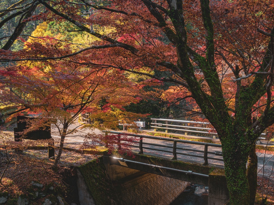 つり橋付近から、県民の森の中心部に下っていくと、橋のかかった紅葉ゾーンがあります
